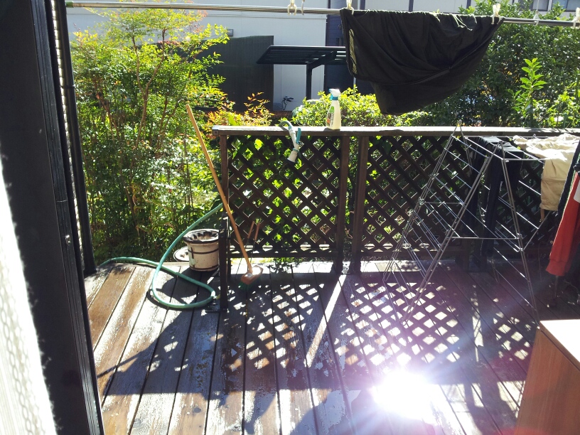 ウッドデッキ清掃中。